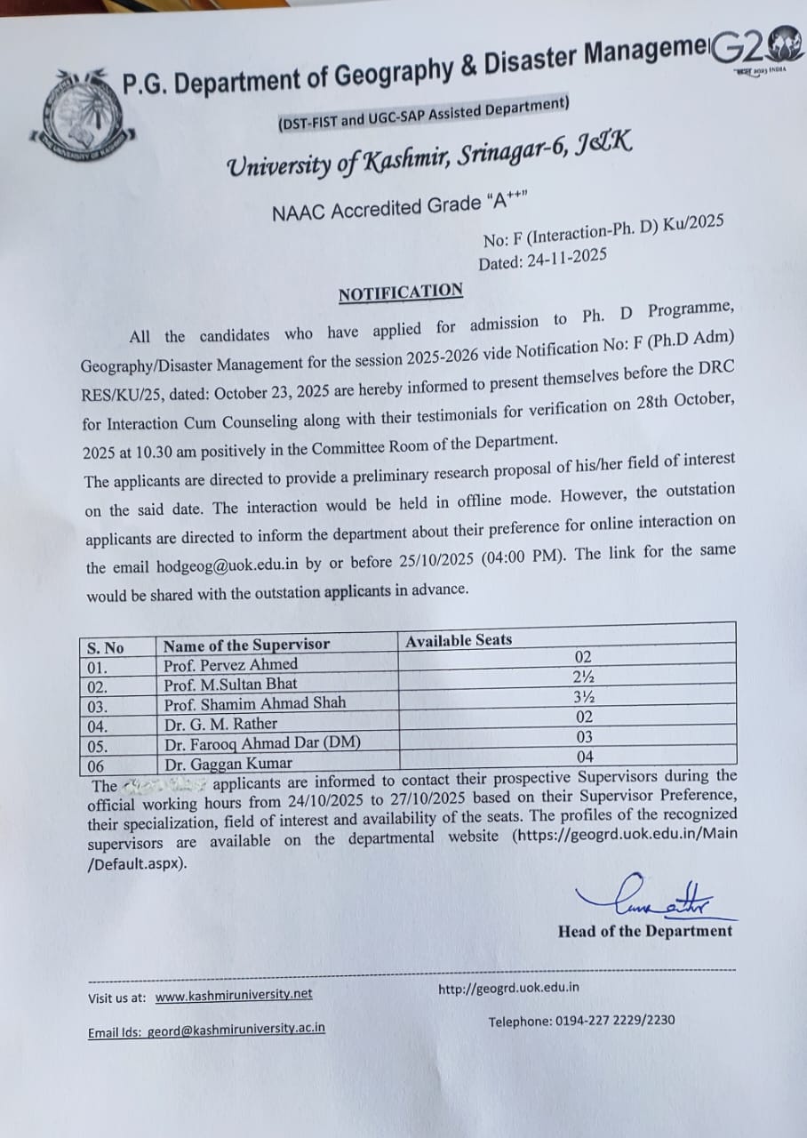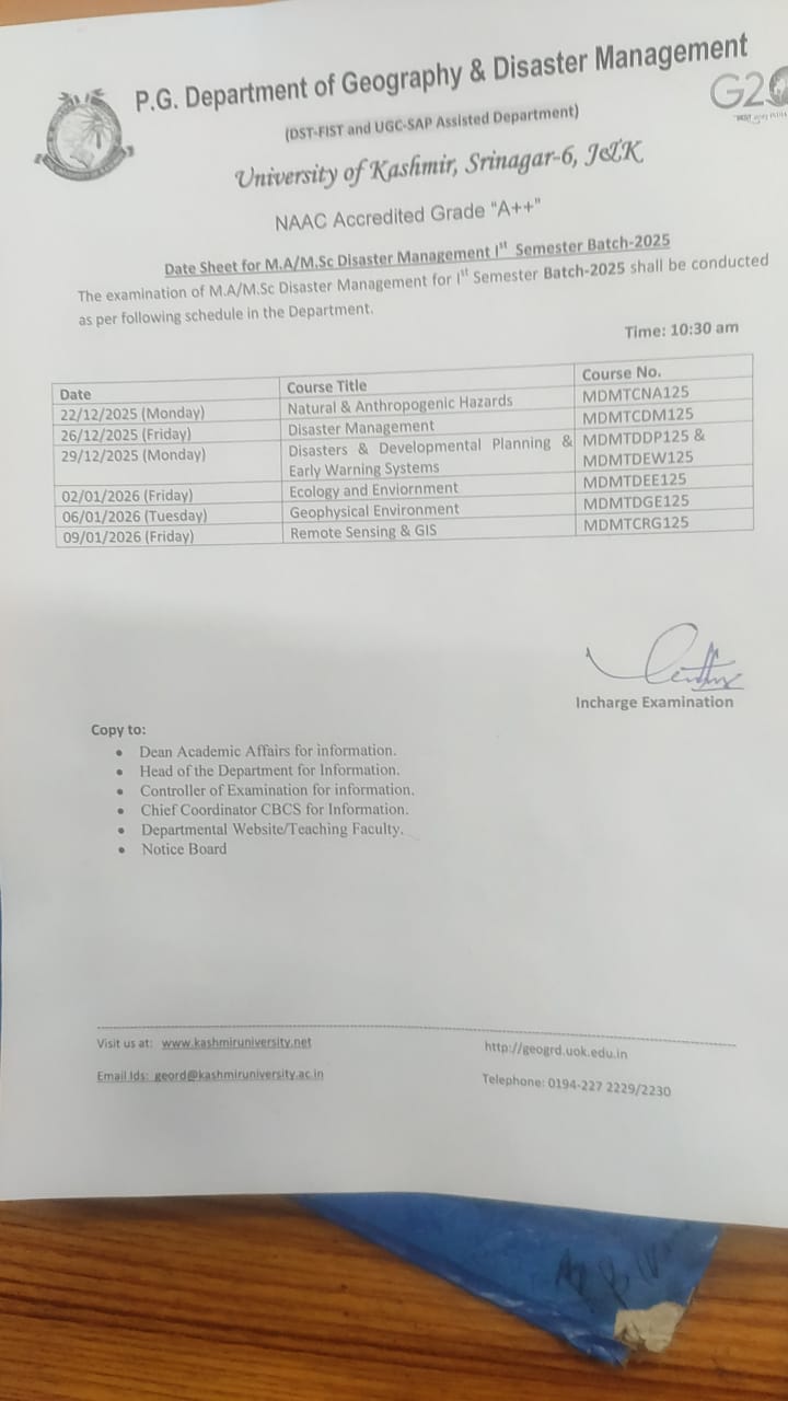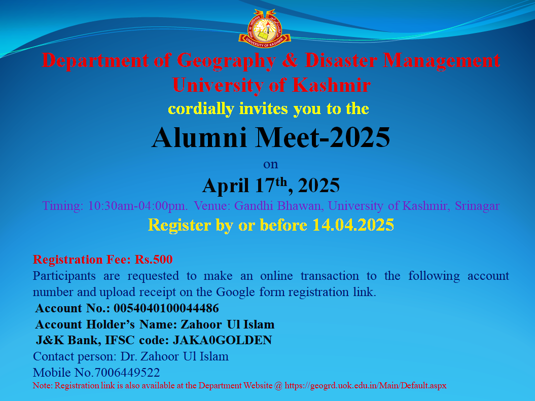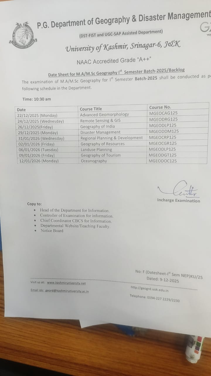 The Department of Geography & Regional Development was established in 1979 under the Vice Chancellorship of Prof. Wahiduddin Malik and was headed by Prof. Nasseruddin Ahmed with the objective to play an important role in planning and development of the state of Jammu & Kashmir. The Department was rechristened as Department of Geography & Disaster Management in the year 2021.The Department has set up a state of the art Remote Sensing and GIS(Geographic Information System) laboratory equipped with about fifty computer systems and related accessories. The laboratory has been establish