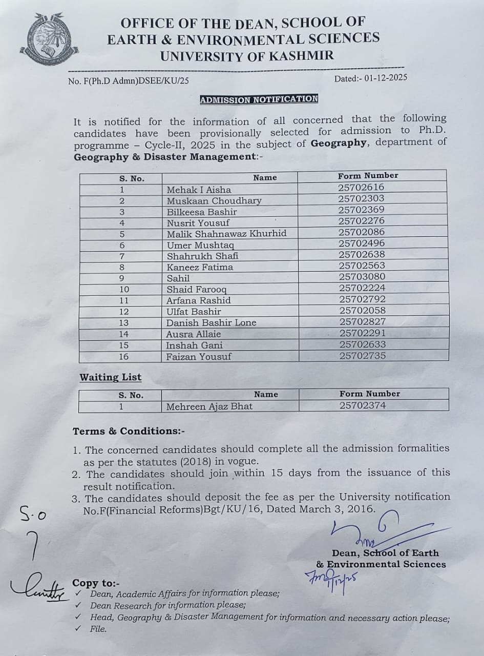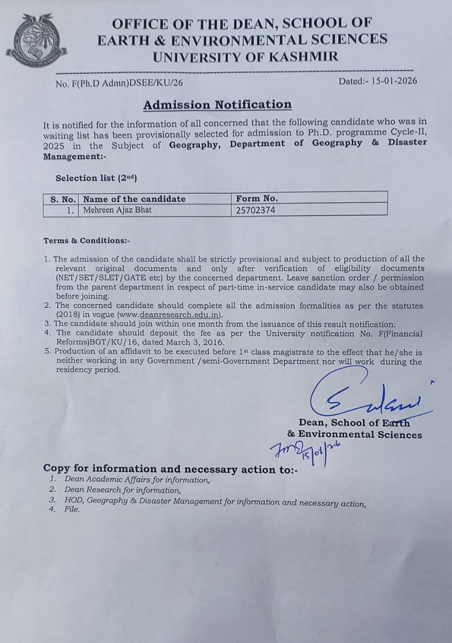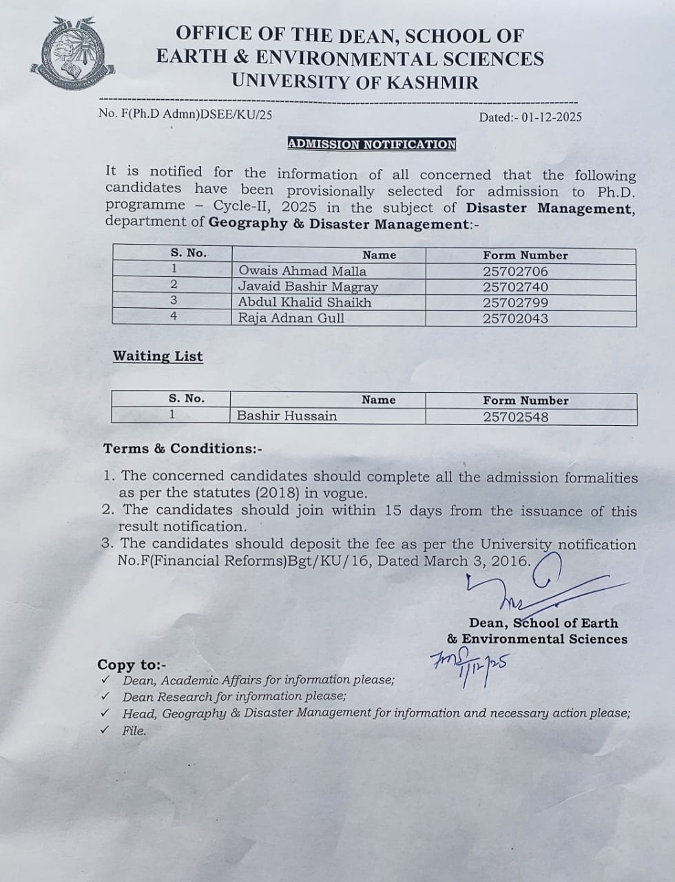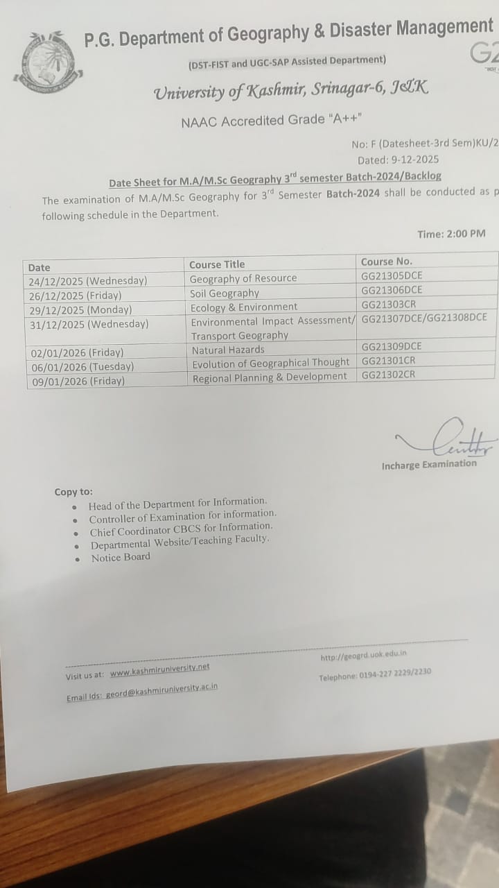 The Department of Geography & Regional Development was established in 1979 under the Vice Chancellorship of Prof. Wahiduddin Malik and was headed by Prof. Nasseruddin Ahmed with the objective to play an important role in planning and development of the state of Jammu & Kashmir. The Department was rechristened as Department of Geography & Disaster Management in the year 2021.The Department has set up a state of the art Remote Sensing and GIS(Geographic Information System) laboratory equipped with about fifty computer systems and related accessories. The laboratory has been establish
